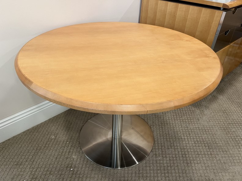 Creative Wood 42D x 29H Round Table With 1.25 Inch Thick Top, Beveled Edge In Maple Wood Veneer With Brushed Steel Disk Base