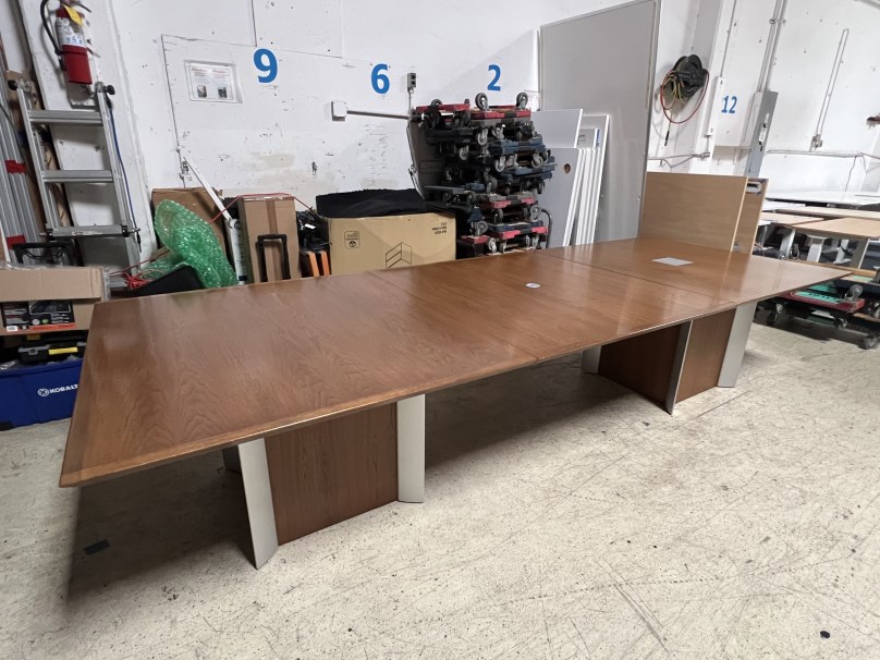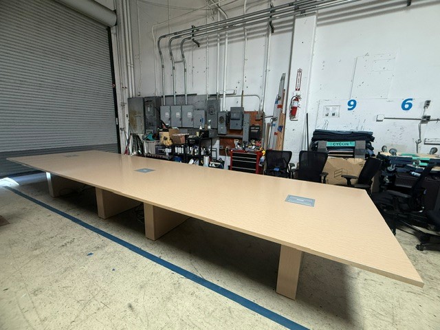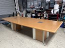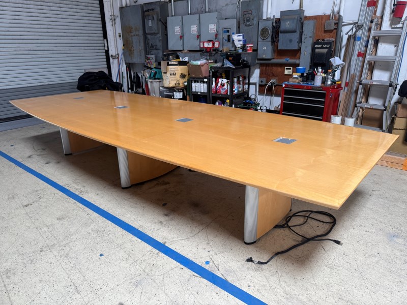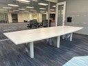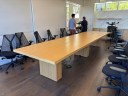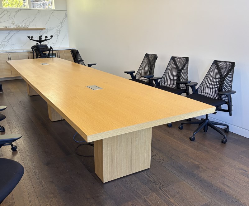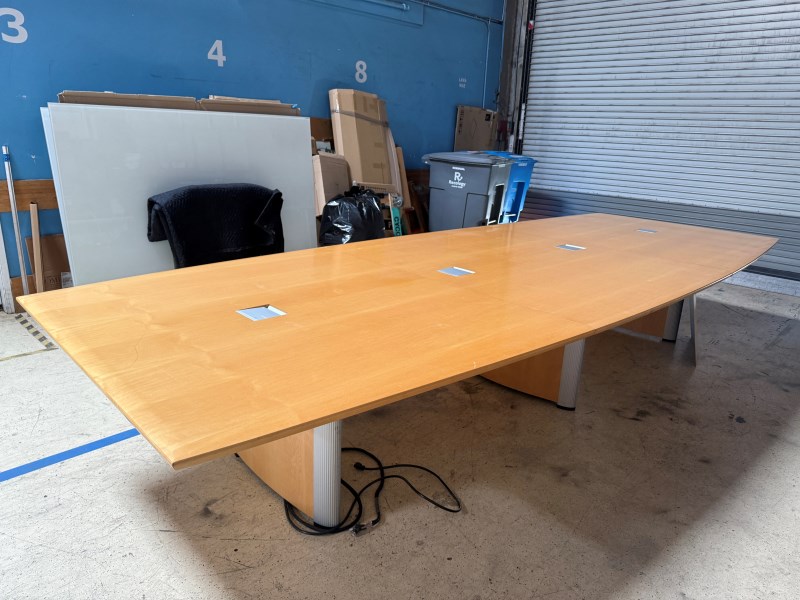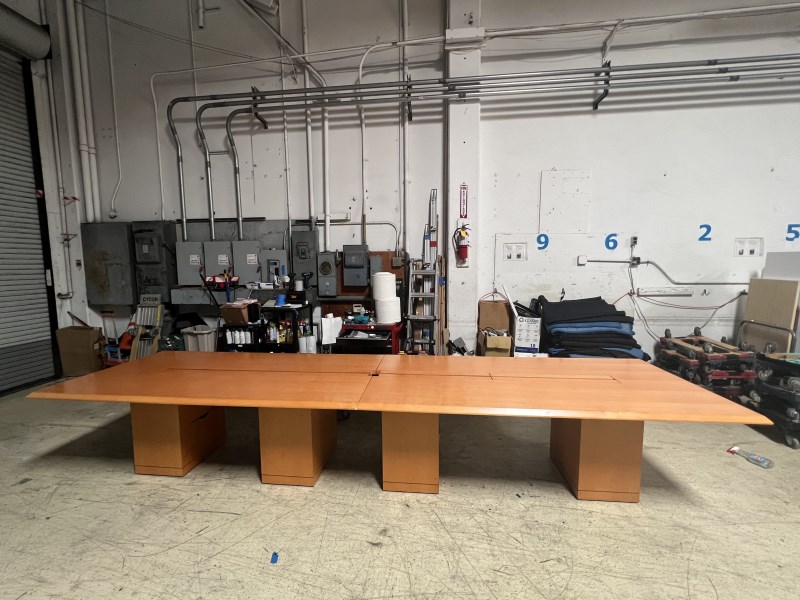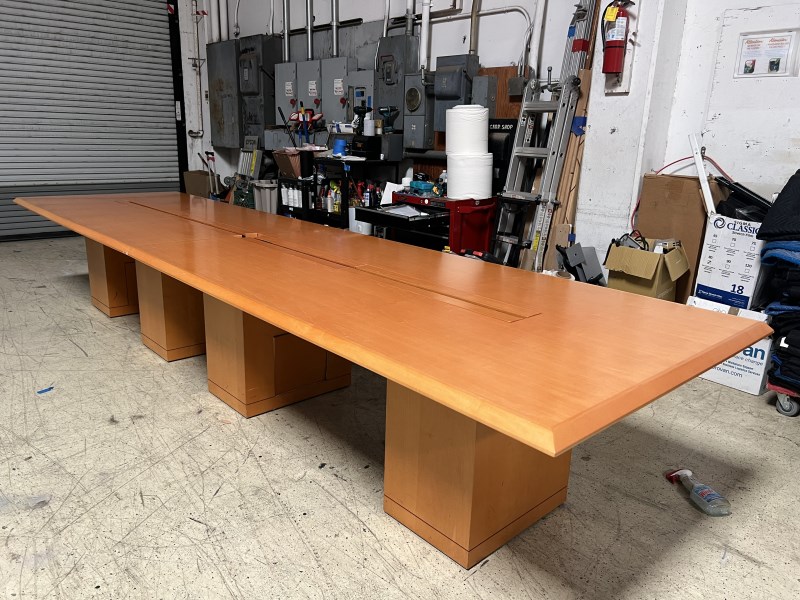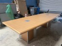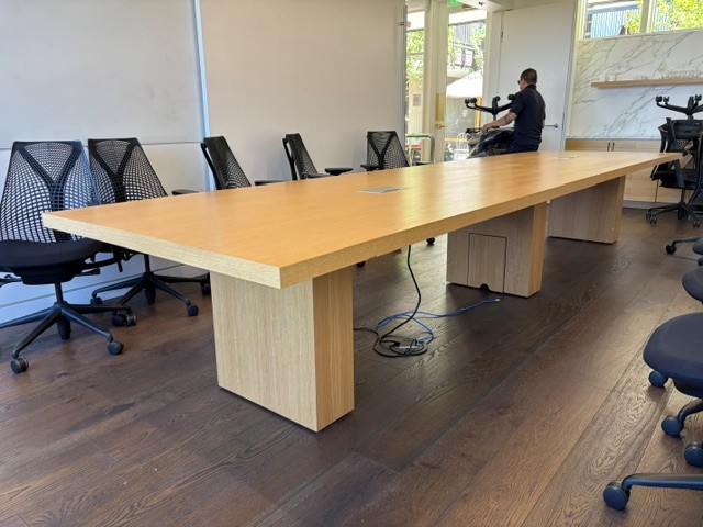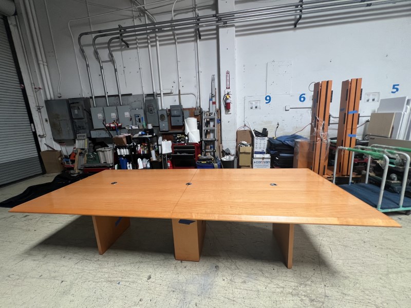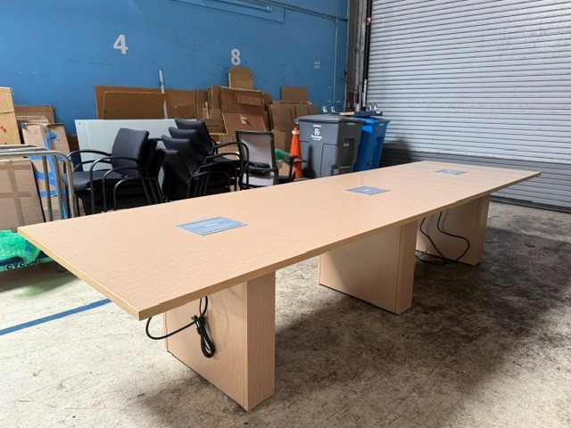 Ideal Manufactuing 16 Ft x 4 Ft Rectangular Table (2 Piece Top), (2) Power & Data Modules. (3) Box Bases. Access Door On 1 Base. White Oak Quarter Cut Veneer