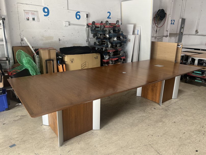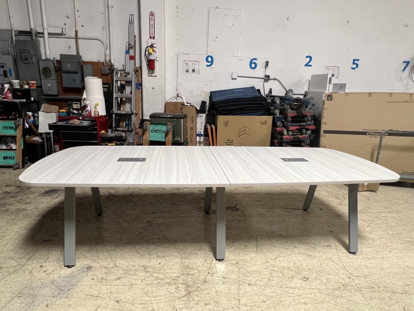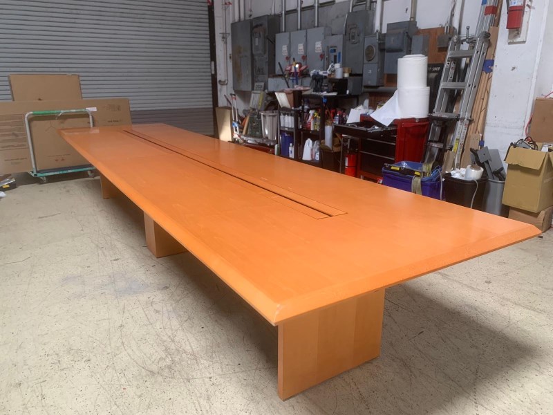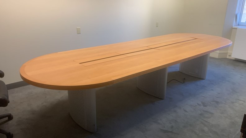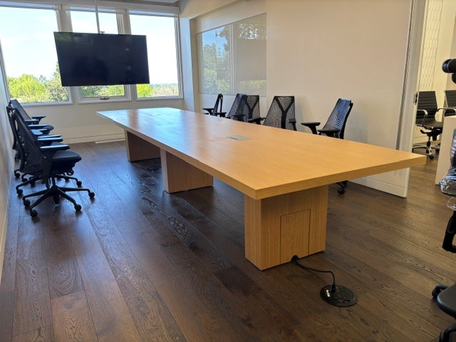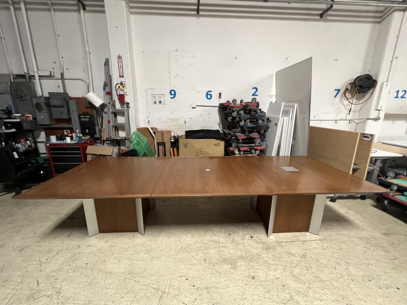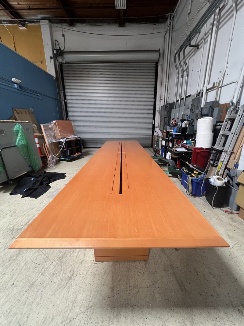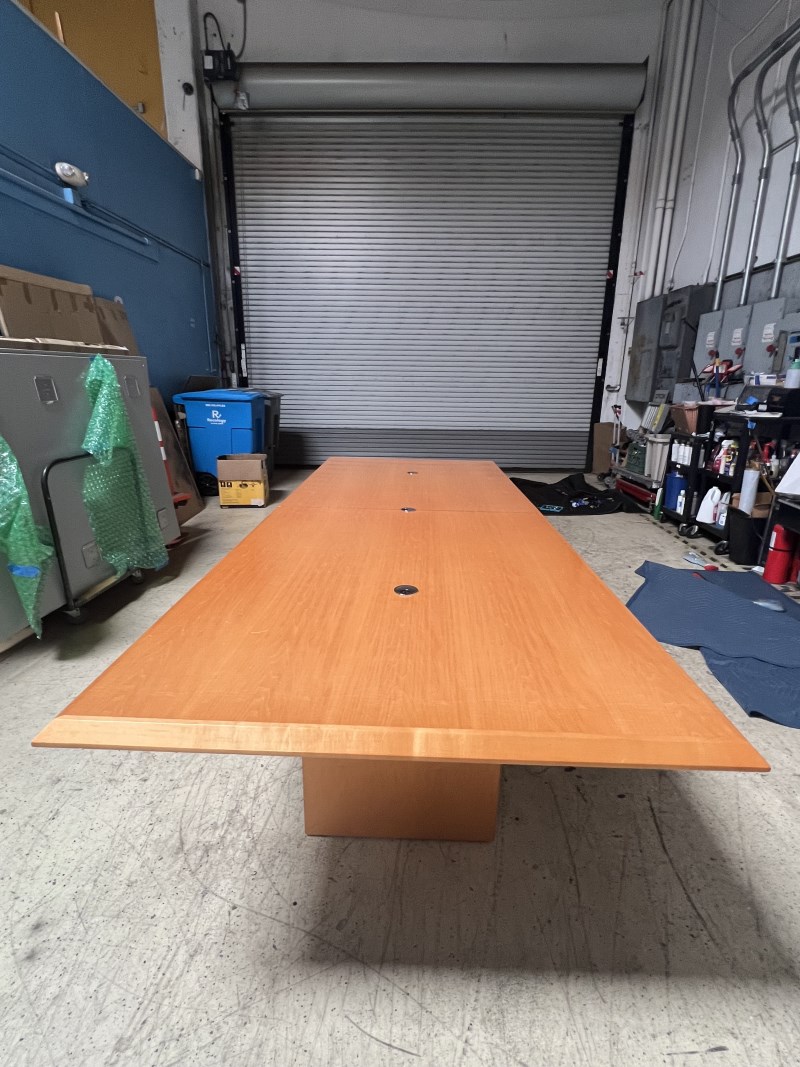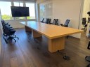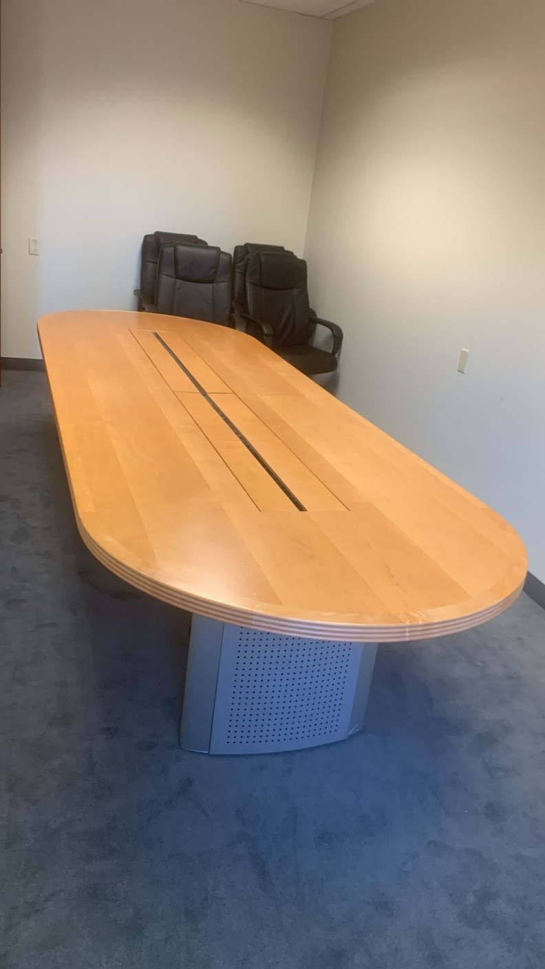 Ideal Manufactuing 16 Ft x 4 Ft Rectangular Table (2 Piece Top), (2) Power & Data Modules. (3) Box Bases. Access Door On 1 Base. White Oak Quarter Cut Veneer