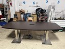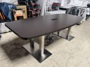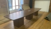 84L x 40D & 48D Boat Shaped Table (1 Piece Top) With Flip Door Power Module & (2) Rectangular Bases With Access Doors & Aluminum Plinth In Dark Maple Wood