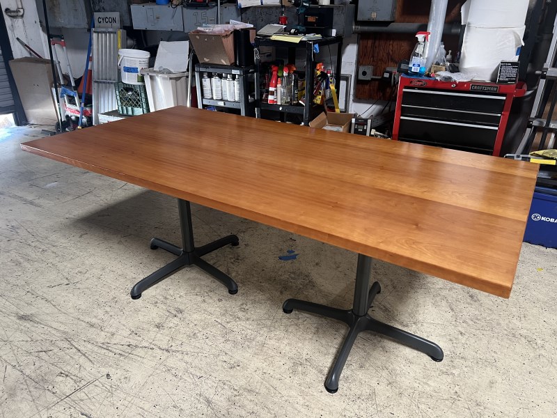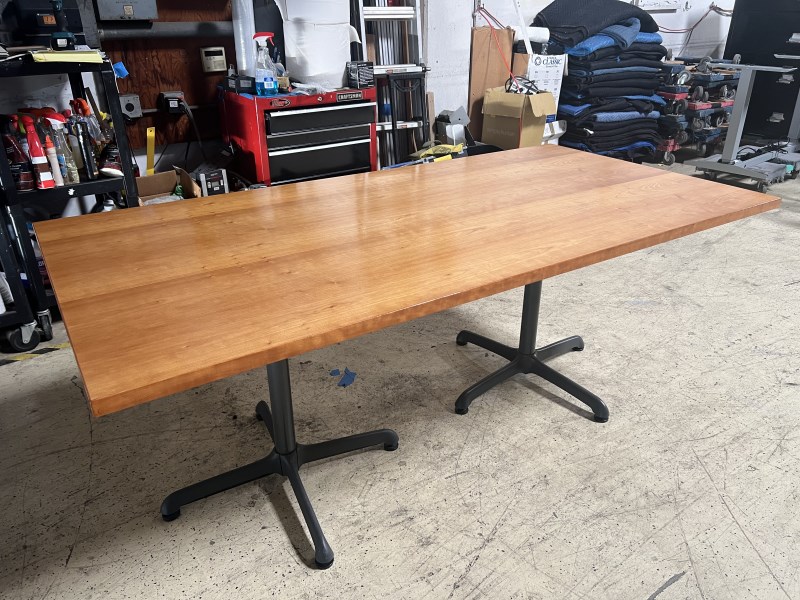 15 Ft x 4 Ft Rectangular Table (2 Piece Top) With Wooden Flip Door Access Power Modules, Trough, (4) Rectangular Bases With Access Doors on 2 Bases. Warm Maple Wood. Beveled Edge
