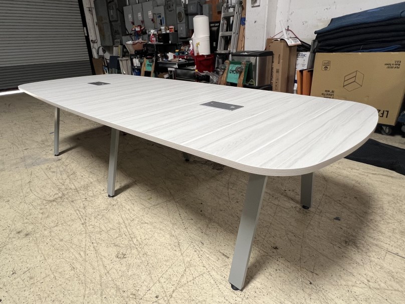 11 Ft Long x 3 Ft & 4 Ft Boat Shaped Table (1 Piece Top). Ash Wood Top. White Glass Insert, (2) Power Modules. 3 White Accent Rectangular Bases With Access Doors
