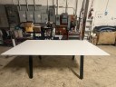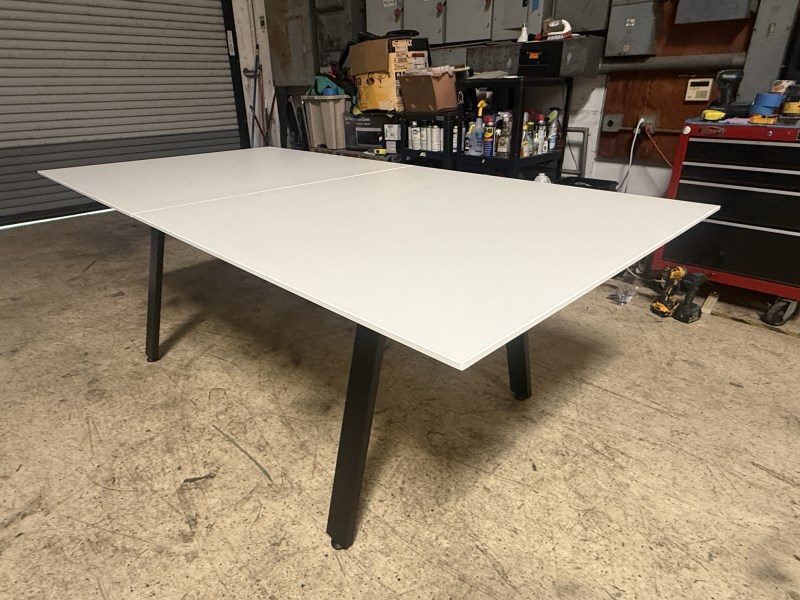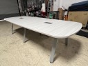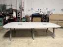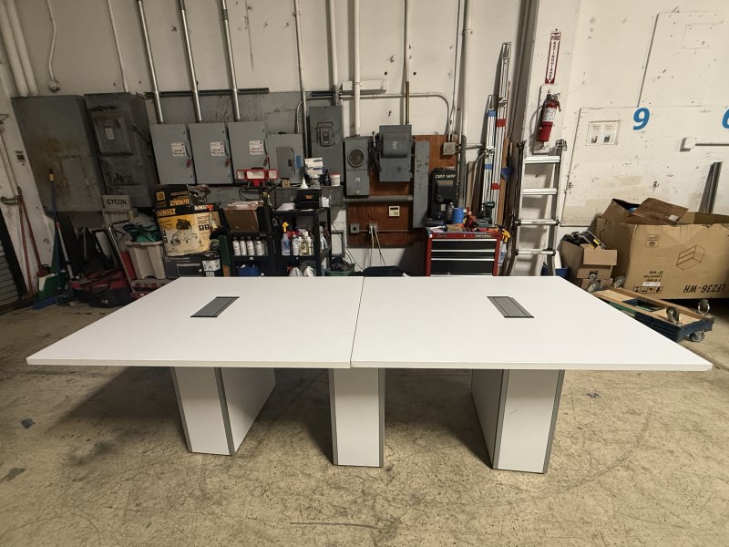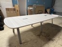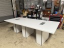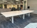 Steelcase 101.5L (8.5 Ft) x 42D (3.5 Ft) Rectangular Table (2 Piece Top) In White Laminate With (2) Nickel Finish Power & Data Modules & (3) Rectangular Bases In White With Silver Accent