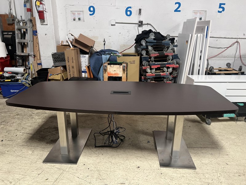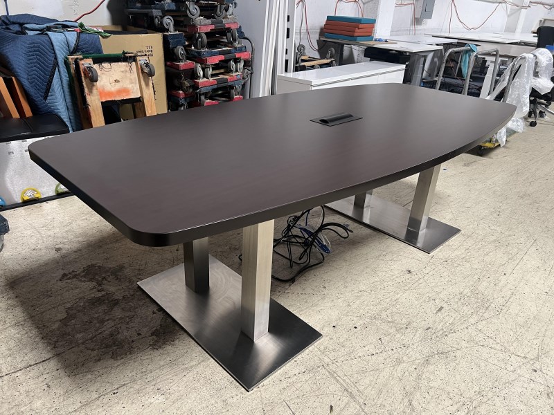 PL Series 95L x 44D Boat Shaped Table (1 Piece Top) In Mahogany Laminate With 1 Power & Data Module & (2) Brushed Steel Bases