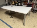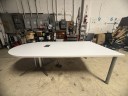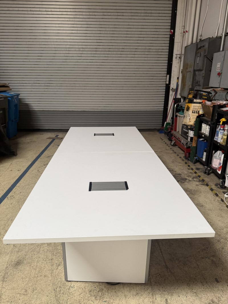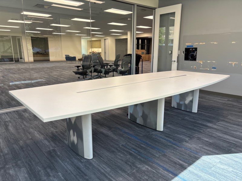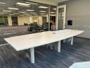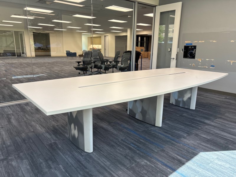 Friant 12 Ft x 4 Ft & 5 Ft Boat Shaped Table (2 Piece Top) In White Laminate WIth Flip Door Access Power Modules & (3) White Accent Aluminum Panel Bases