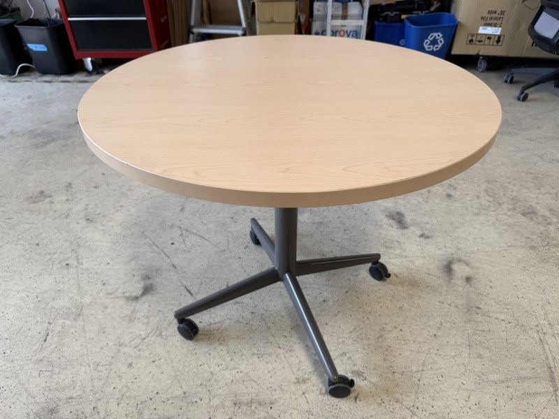 36D x 29H Mobile Round Table In Maple Laminate Top With Black Post, 4 Star Dark Grey Metal Base & Locking Casters