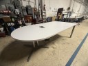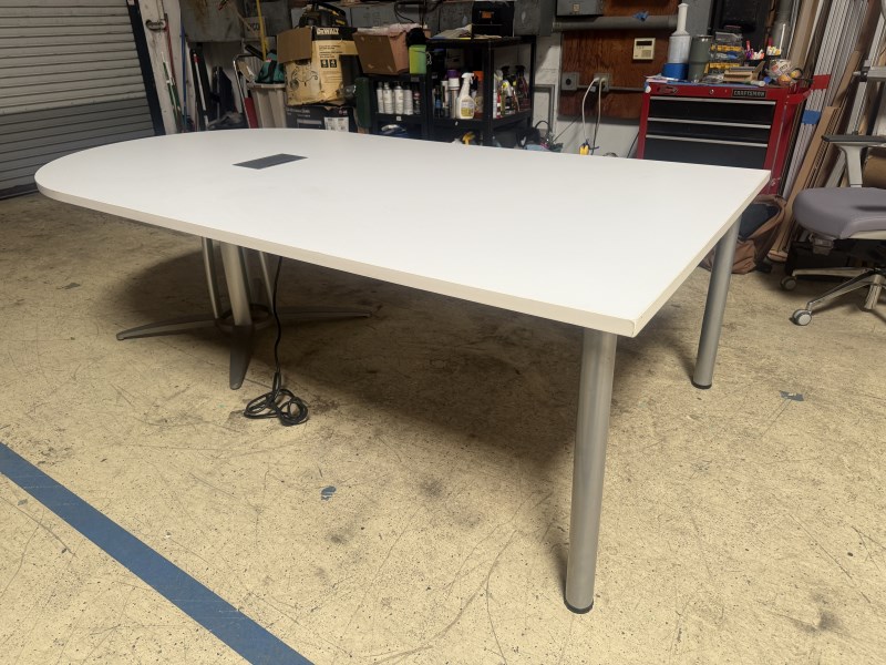 HPL 93L x 49D Half Racetrack Table (1 Piece Top) In White Laminate Top With Power Module. (2) Silver Finish Cylinder Legs & (1) 4 Star Metal Base