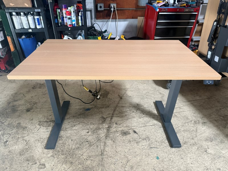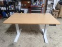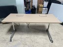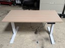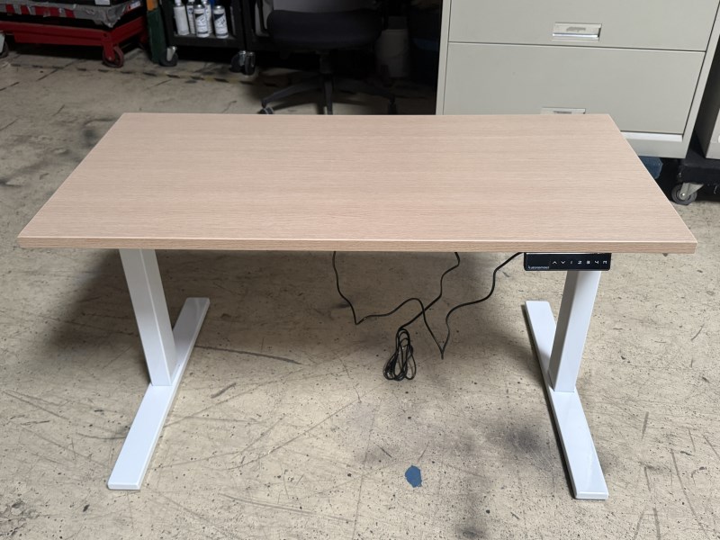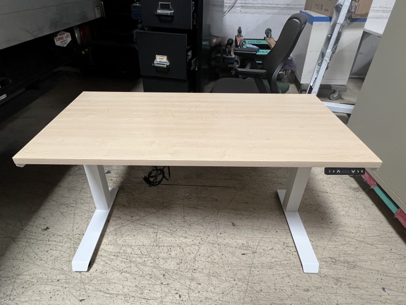 Steelcase Migration 58W x 29D Electric Height Adj Sit Stand Desk. Clear Oak Laminate Top. 3 Stage White Metal T Legs. Height Adj From 23H - 49H