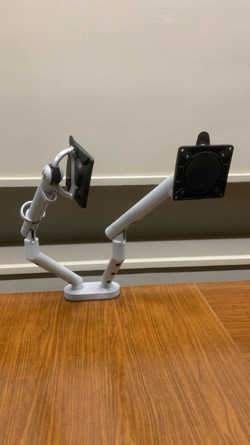 Herman Miller Flo Dual Monitor Arms In Silver Finish. Hold 2 Monitors From 7 to 20 Lbs Each