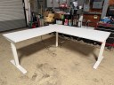 AMQ Electric Height Adjustable Sit Stand L Shaped Left Return Desk In White Laminate Top With 4 Programmable Memory Setting & 3 Stage White T Legs. Height Adjust From 24.75H to 50.25H