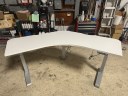 Teknion Boomerang 48W x 48D x 23D Corner Electric Height Adjustable Sit Stand Desk In White Laminate Top. 4 Programmable Memory Setting, 3 Stage Silver Finish Legs. Height Adjusts From 22.5H - 48H