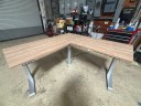 Teknion Boomerang 5 Ft x 5 Ft L Shaped Electric Height Adjustable Sit Stand Desk In Aspen Laminate Top. 4 Programmable Memory Setting, 3 Stage Silver Finish Legs. Height Adjusts From 22.5H - 48H. 60W x 24D Main Desk Top & 36L x 24D Return Top. Left & Right Reversible.