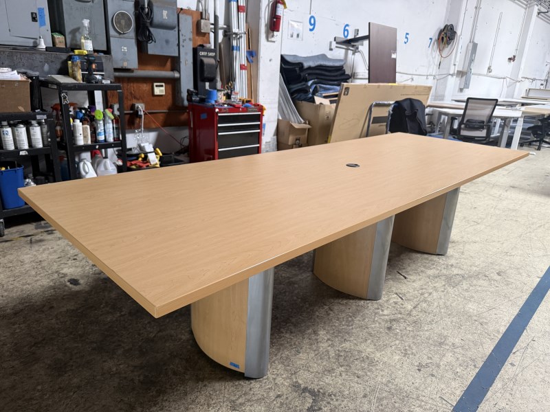 Nienkamper 14 Ft x 4.5 Ft & 5.5 Ft Boat Shaped Table (3 Piece Top) In Maple Wood With (4) Silver Finish Flip Door Power & Data Modules & (3) Anodized Aluminum Duo Bases