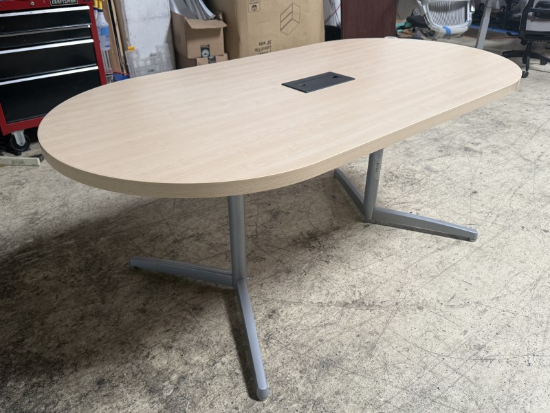 6 Ft x 3 Ft Racetrack Table (1 Piece Top) In Maple Laminate With Black Access Grommet Cover & (2) Silver Finish Metal Legs. New Top, Used Bases