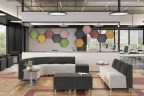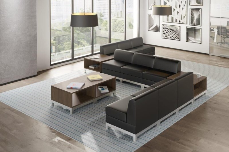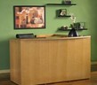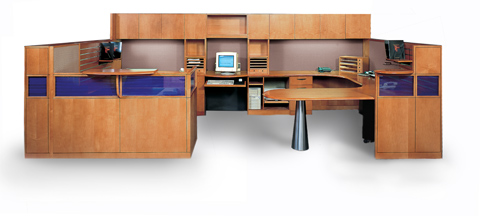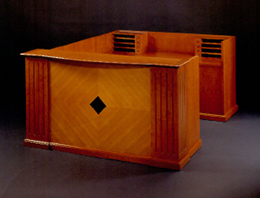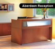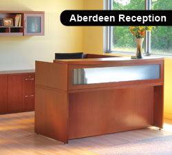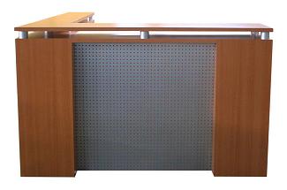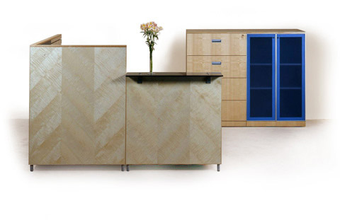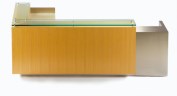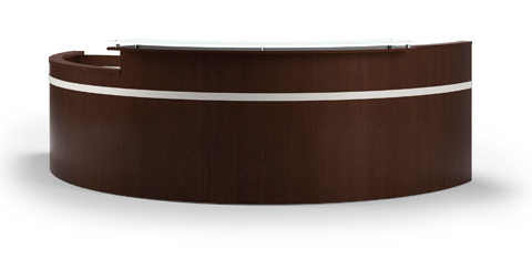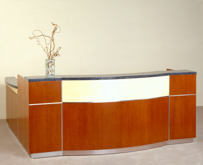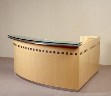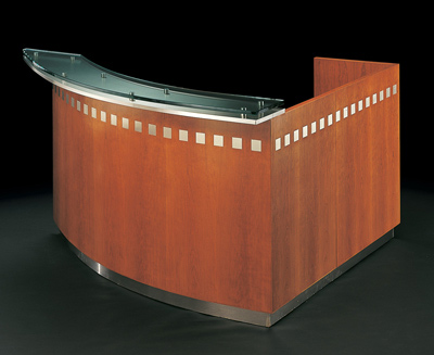Curved Reception Shell With Tower, Contrast Finish Recess Toe Kick, #809 Hardwood Inlay, Clear Glass Transaction Counter With Luma Steel Subtop And Anodized Aluminum Standoffs |