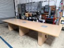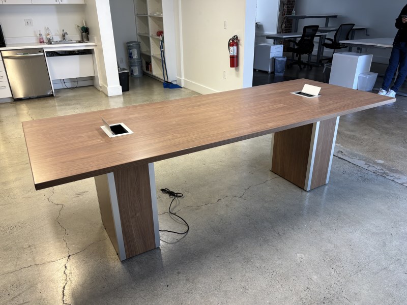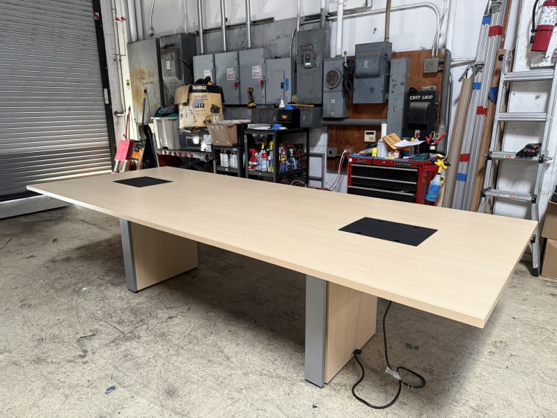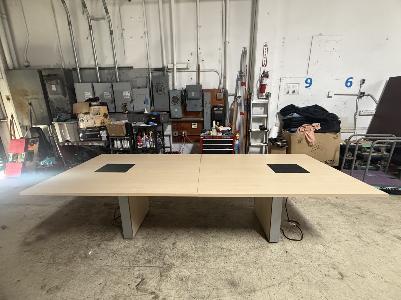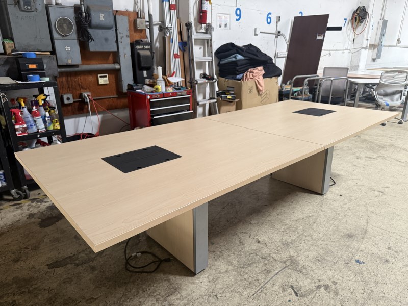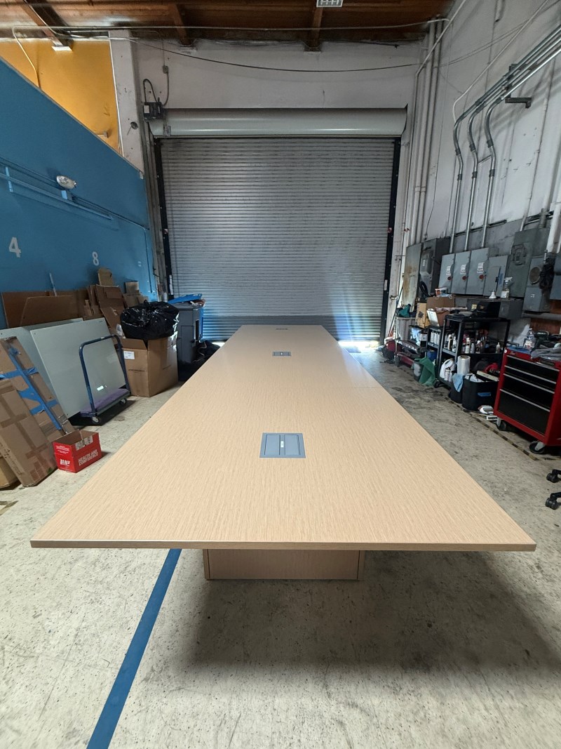 Ideal Manufactuing 16 Ft x 4 Ft Rectangular Table (2 Piece Top), (2) Power & Data Modules. (3) Box Bases. Access Door On 1 Base. White Oak Quarter Cut Veneer