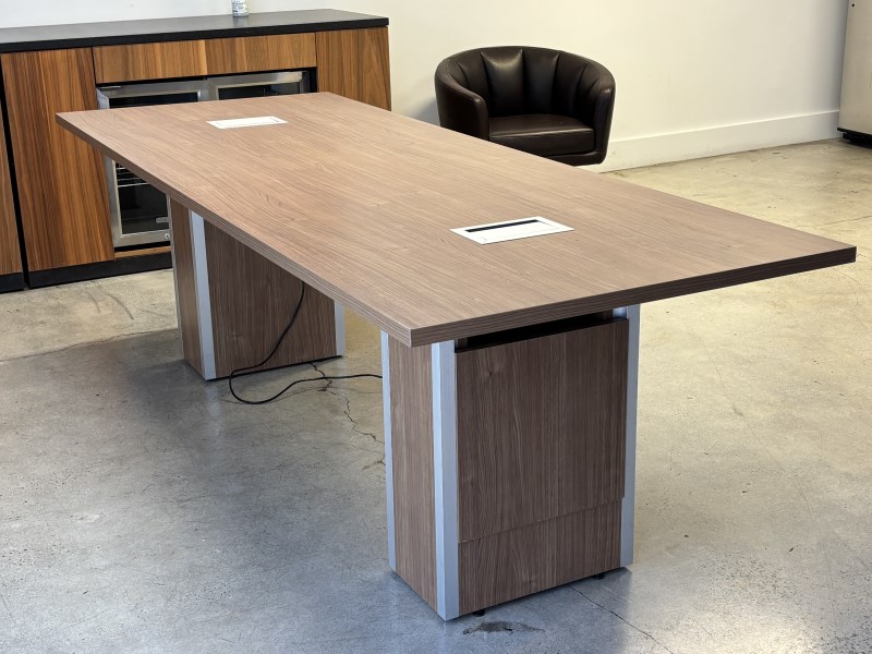 8 Ft x 3 Ft Rectangular Table (1 Piece Top) With (2) Nickel Finish Power & Data Modules & (2) Rectangular Bases In Walnut Laminate