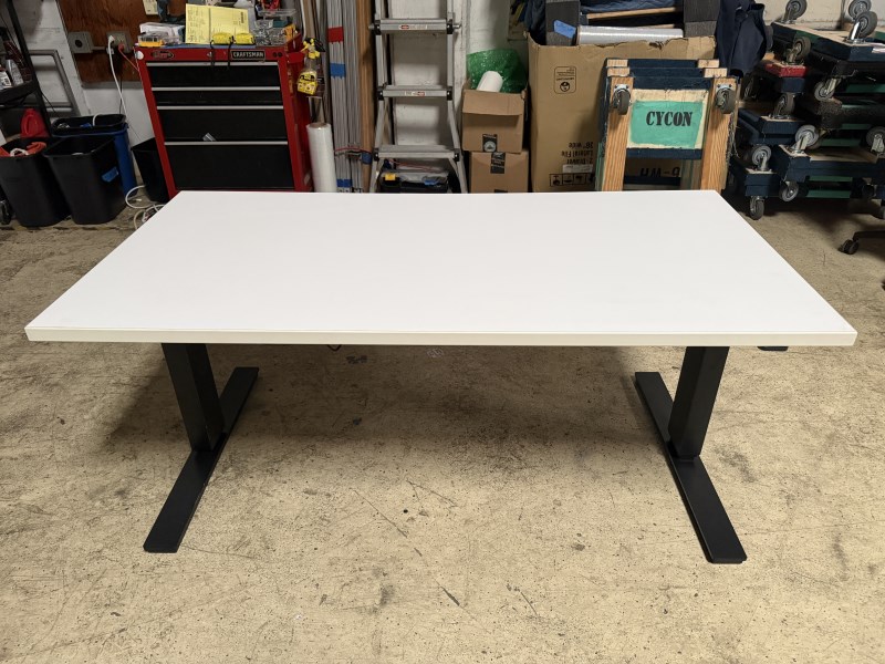 Steelcase 60W x 30D Electric Height Adjustable Sit Stand Table In White Laminate Top With 3 Stage Silver Finish Legs. Height Adjusts From 23H To 48.5H.