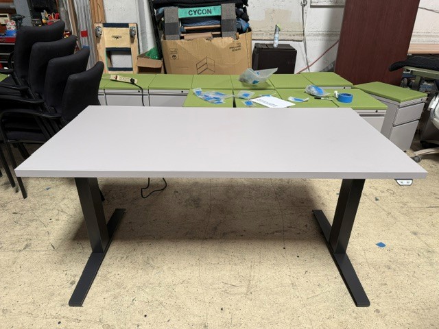 Steelcase 60W x 25.75D Electric Height Adjustable Sit Stand Desk In White Laminate Top With 3 Stage Silver Finish Legs. Height Adjusts From 23H To 48.5H