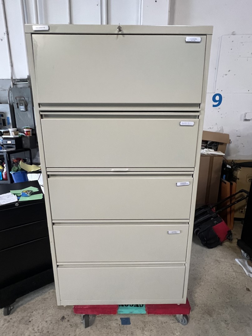 Unknown 36W x 18.5D x 67.25H 5 Drawer Lateral File With Full Pulls In Putty. Top Drawer Comes With Receding Flip Up Door