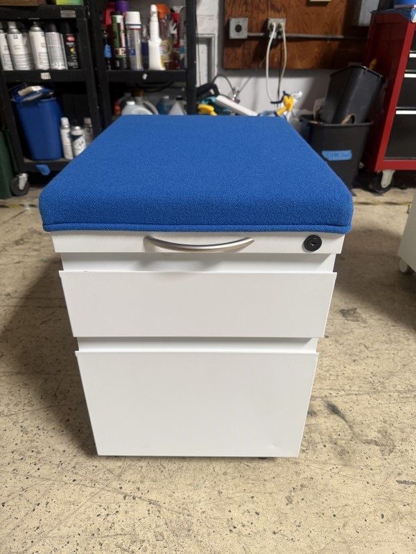 Haworth 15.5W x 17.25D x 22.5H Box File Mobile Pedestal In White Metal With Blue Fabric Cushion Top